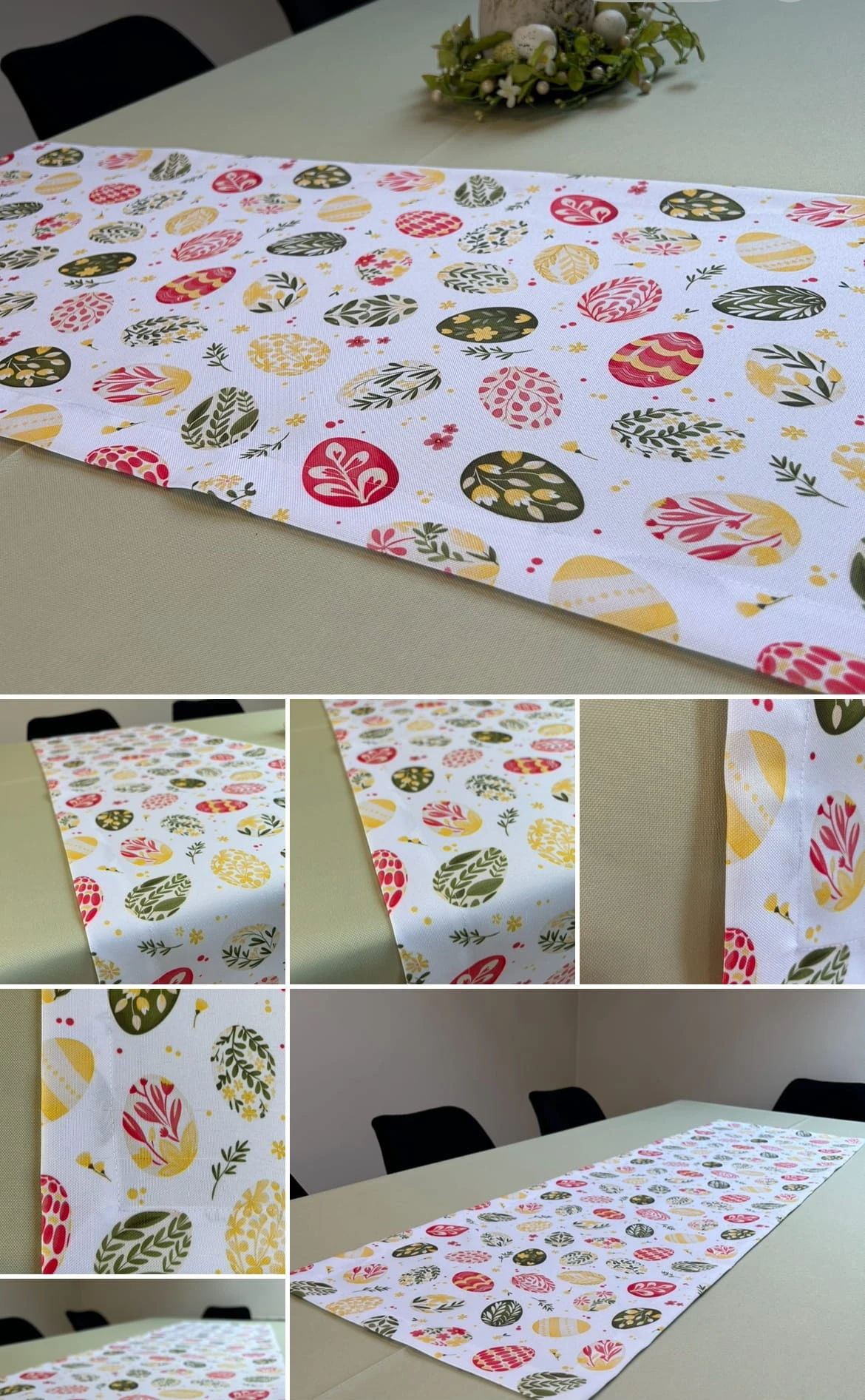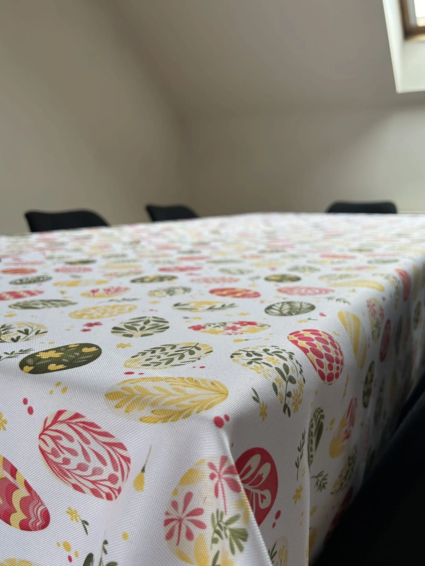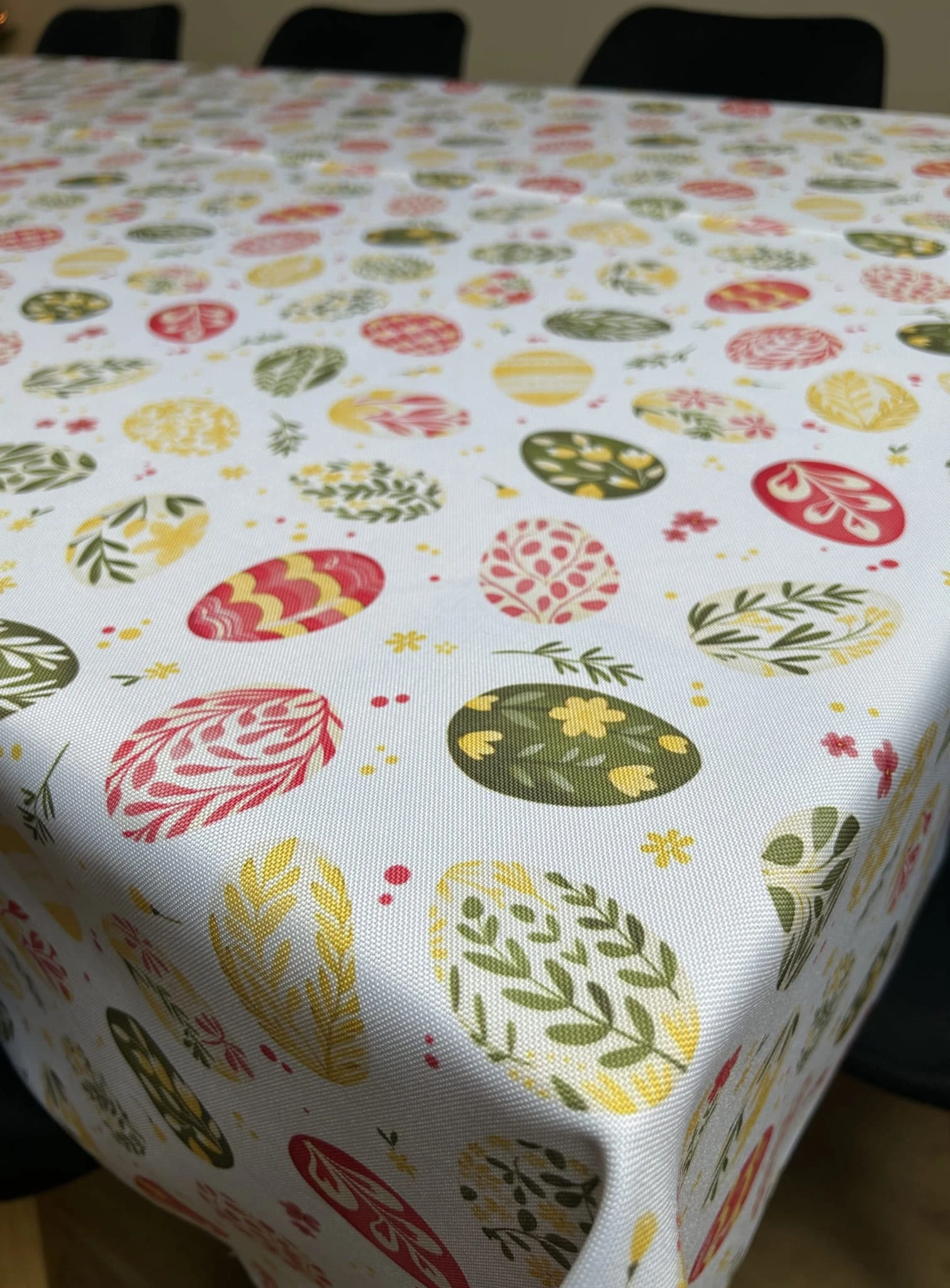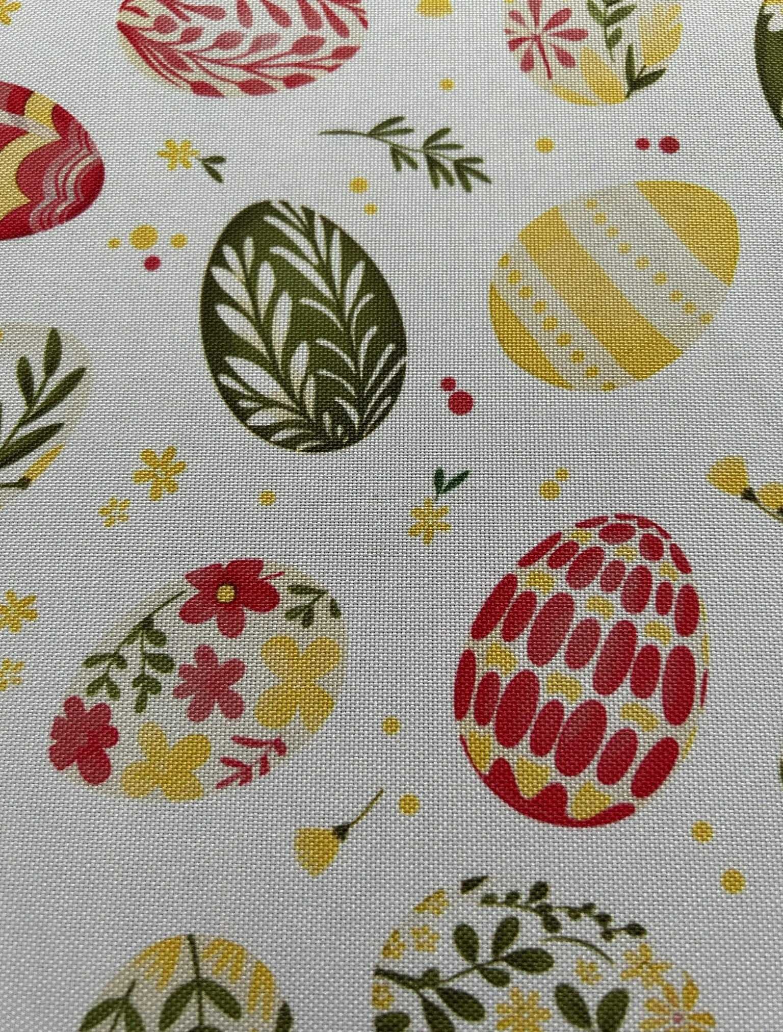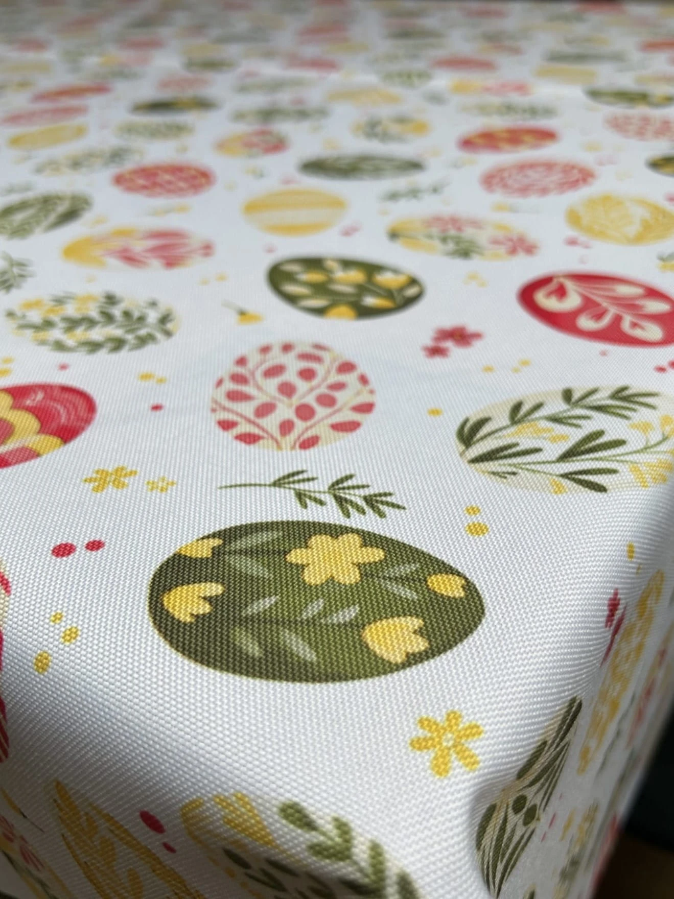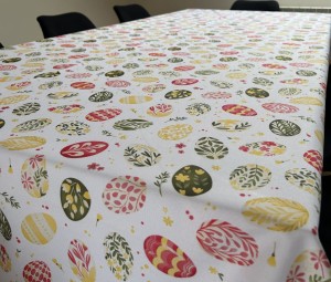 Biały obrus z kolorowym PISANKAMI WIELKANOCNYMI został uszyty z tkaniny wodoodpornej. Ponadto jest on starannie wykończony 4 cm listwą. Występuje w kilku rozmiarach.