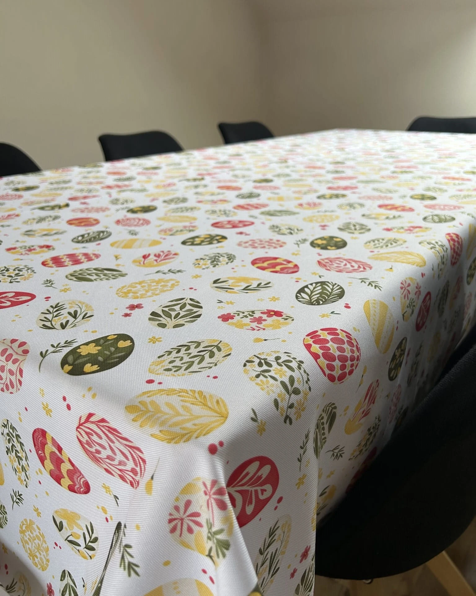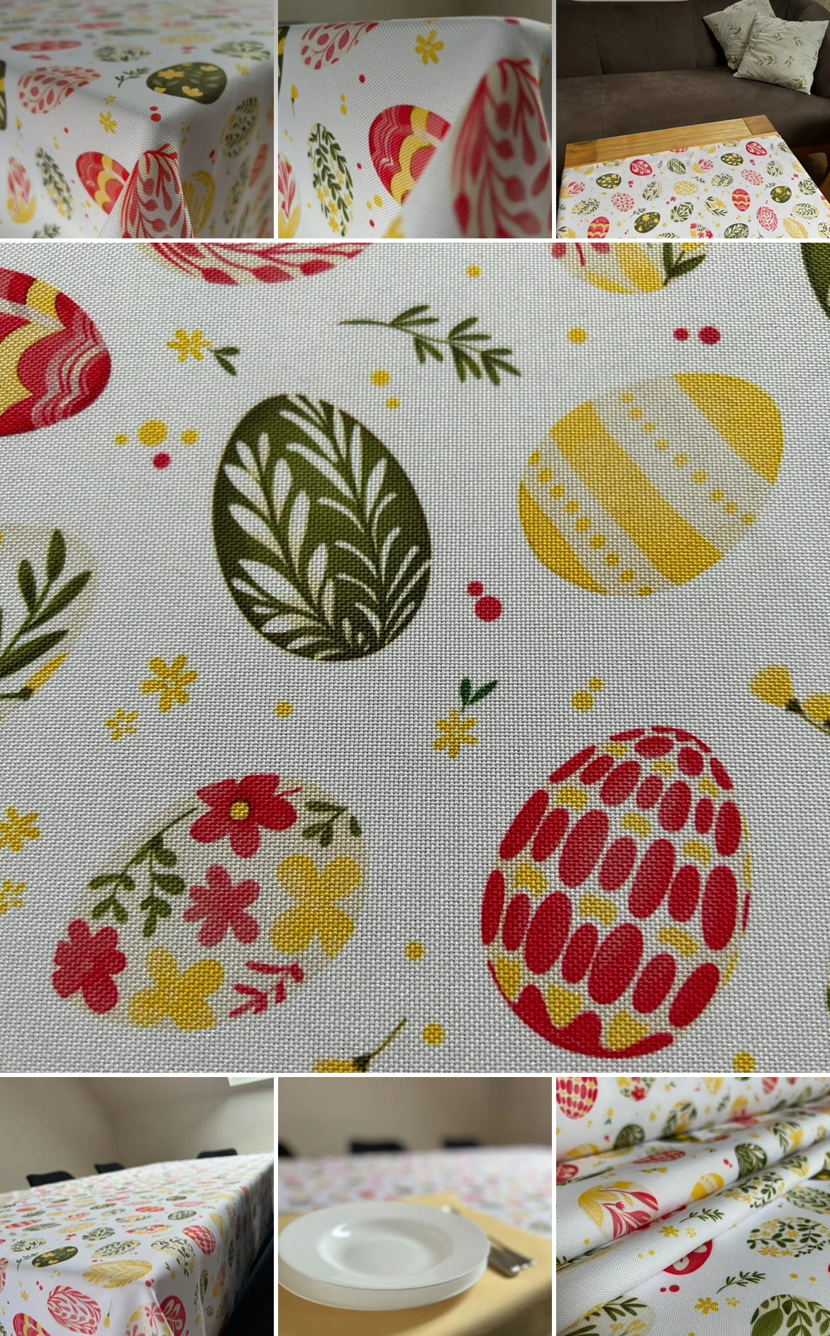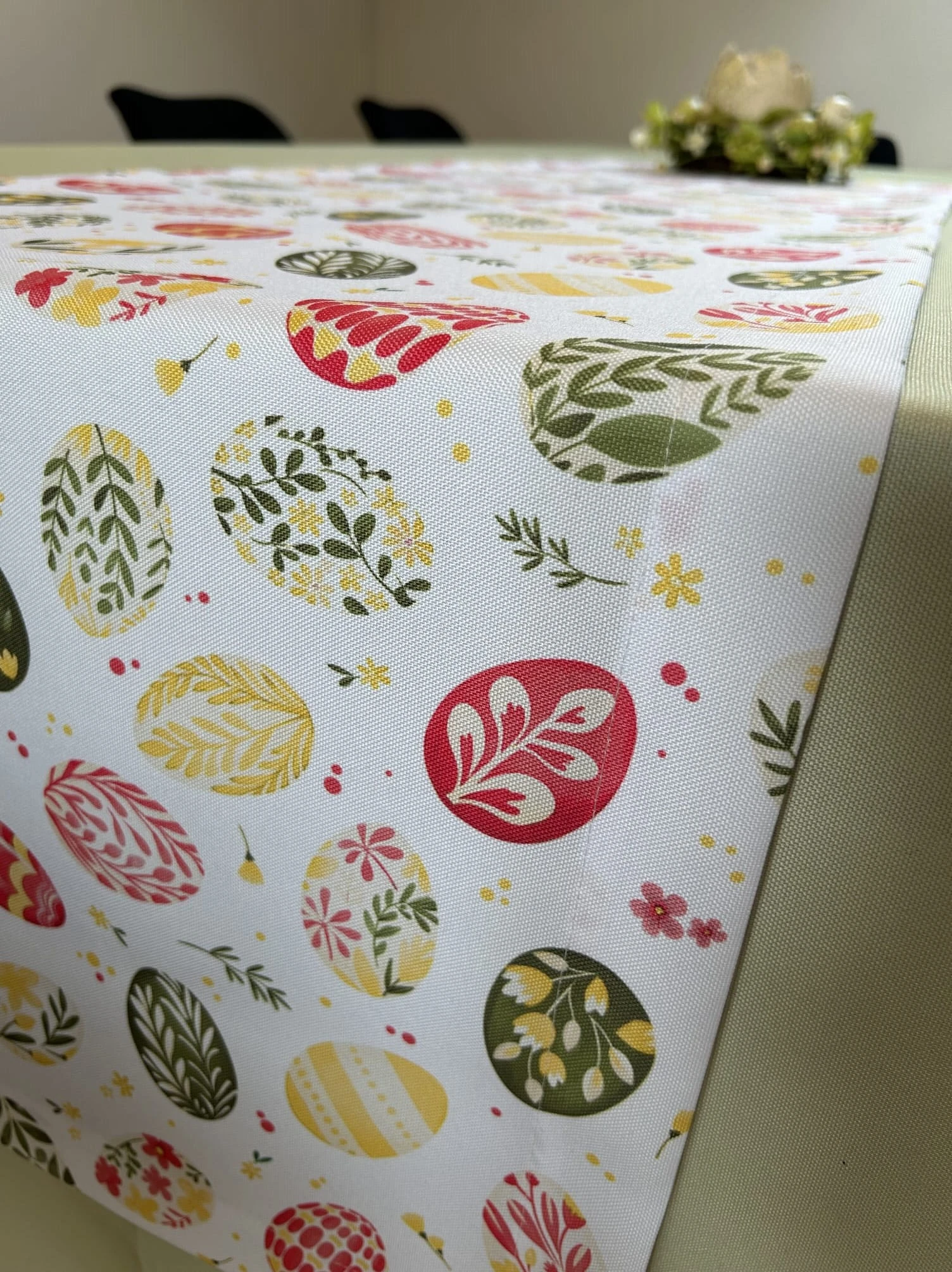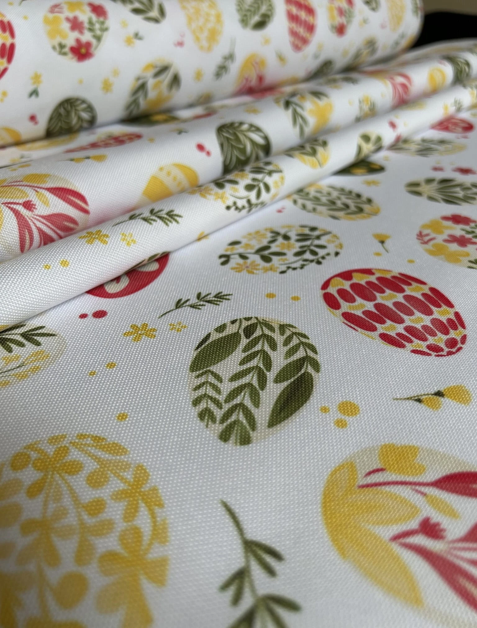 Biały obrus z kolorowym PISANKAMI WIELKANOCNYMI został uszyty z tkaniny wodoodpornej. Ponadto jest on starannie wykończony 4 cm listwą. Występuje w kilku rozmiarach.