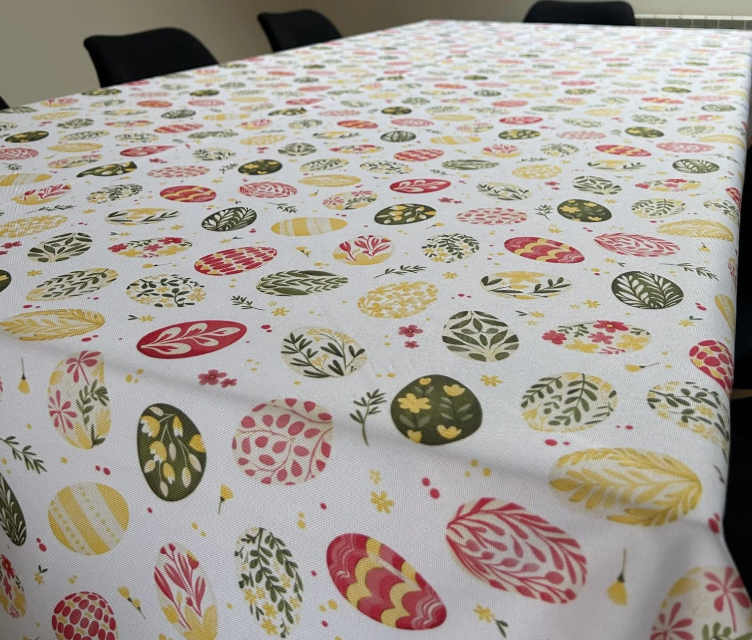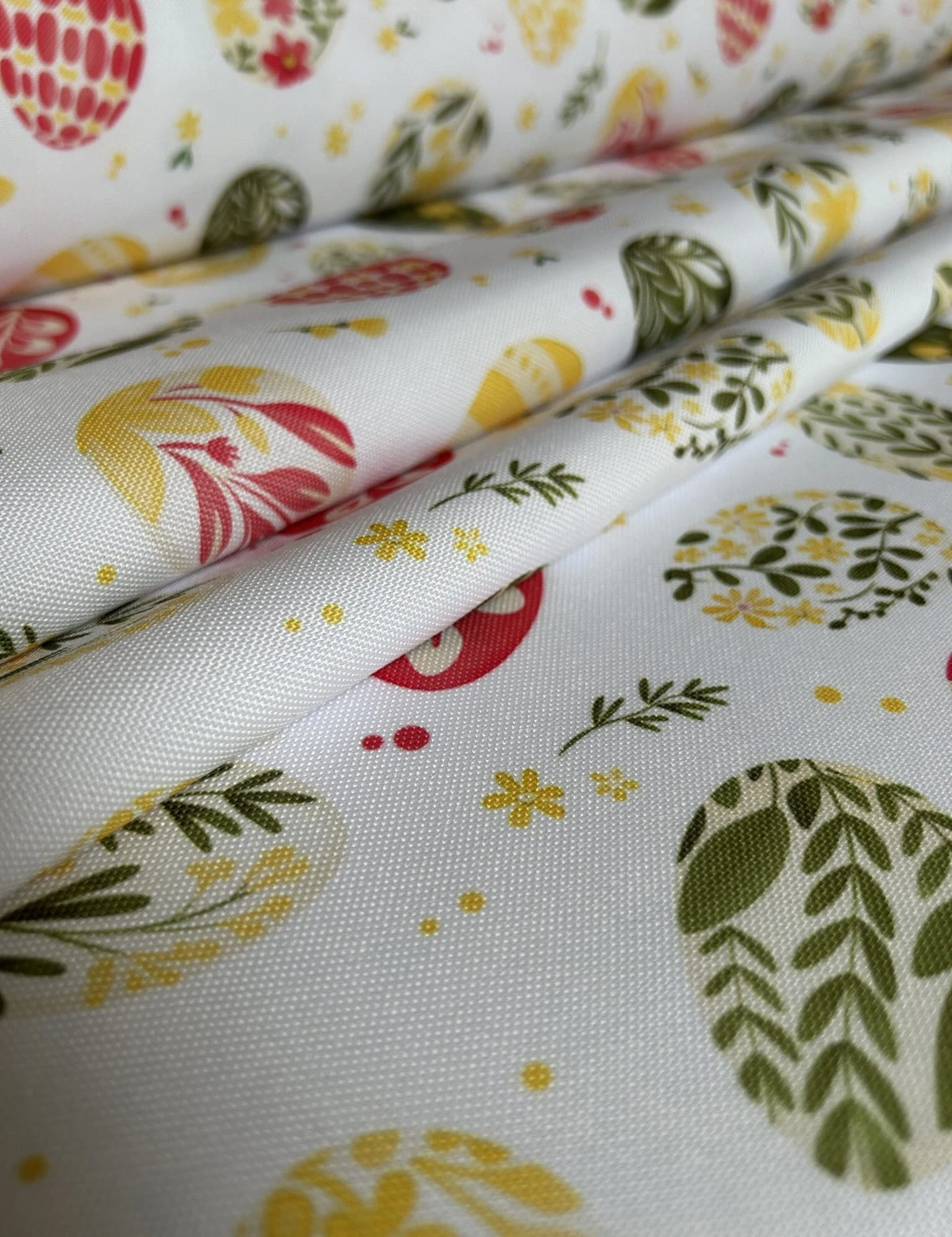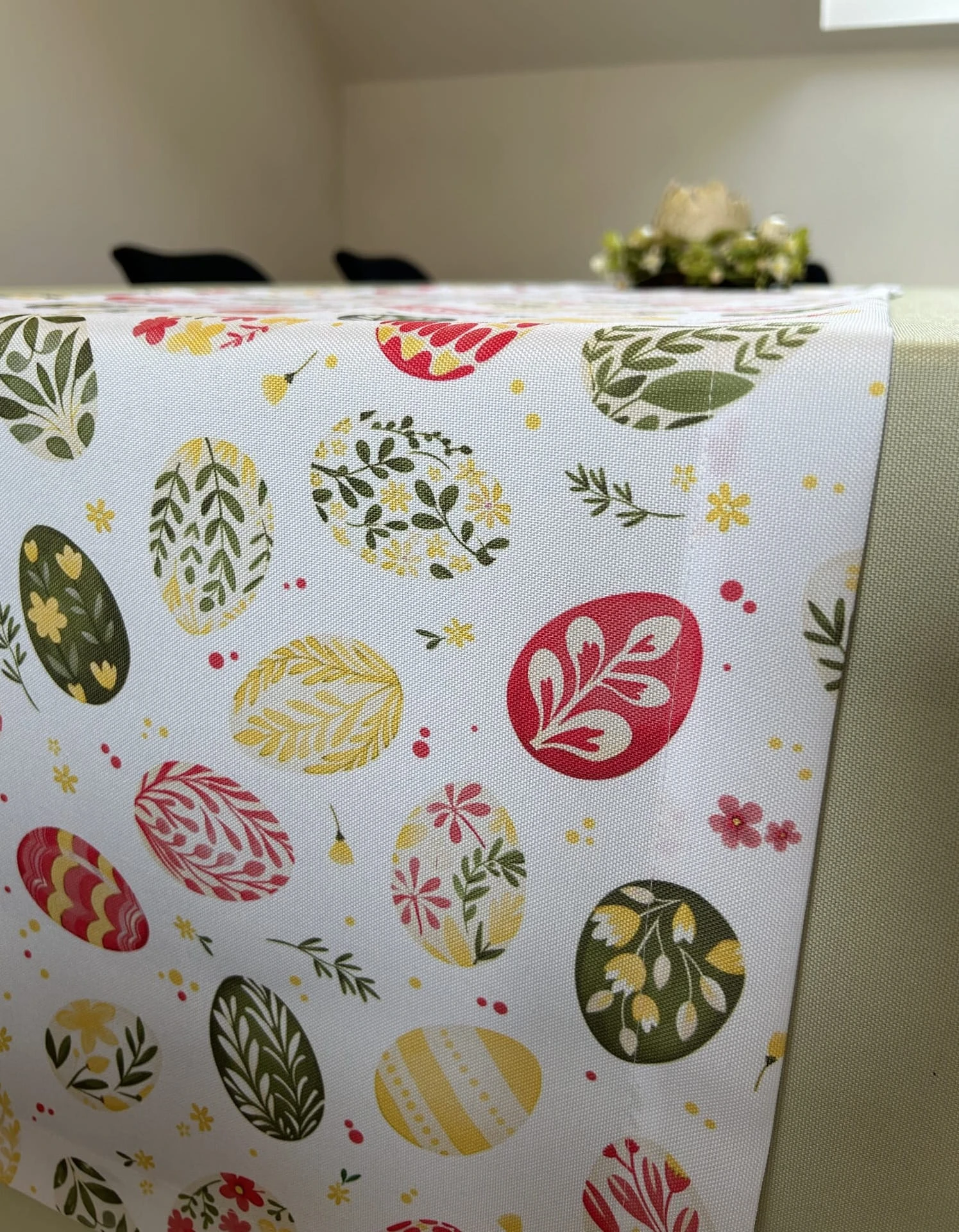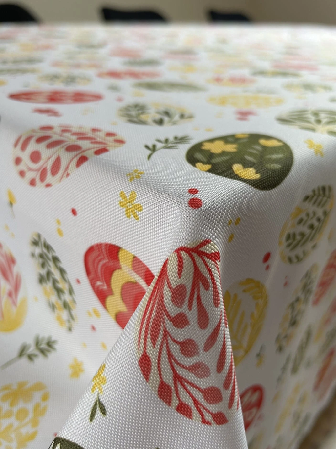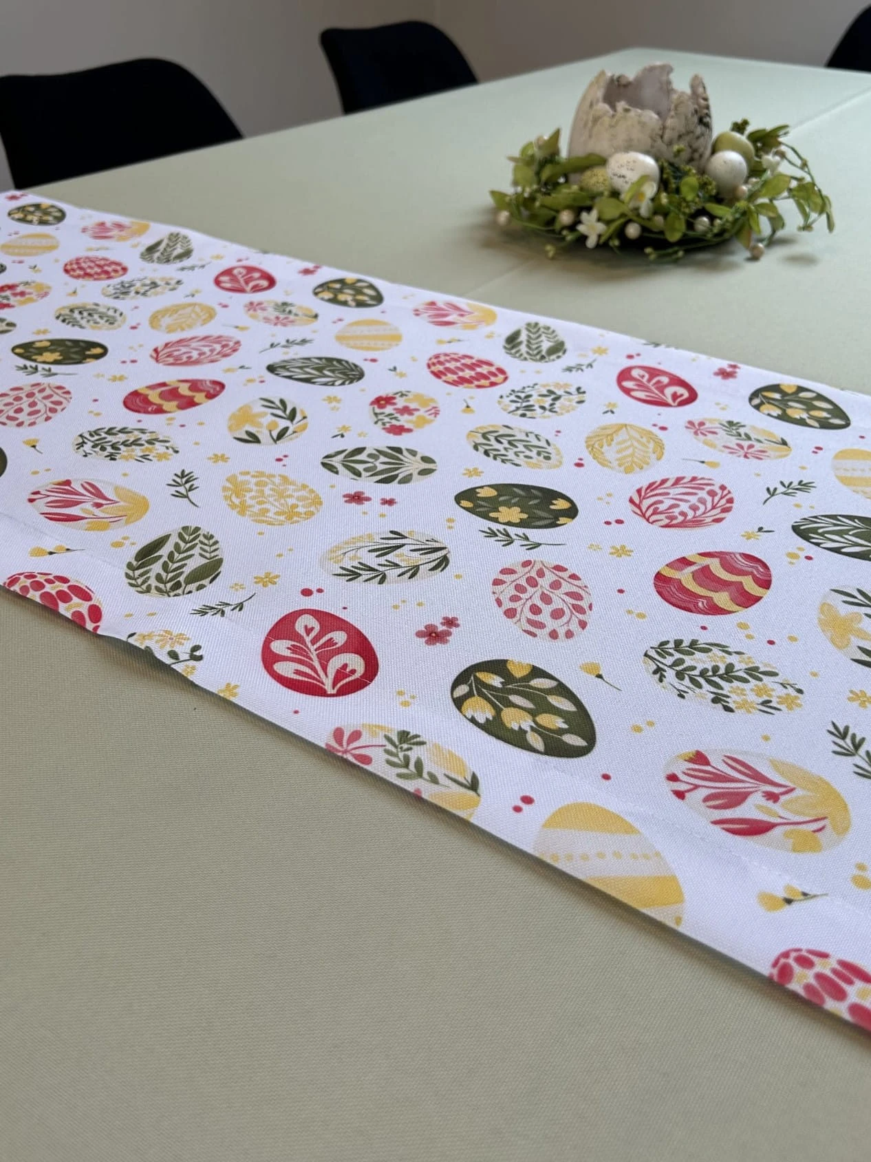 Biały obrus z kolorowym PISANKAMI WIELKANOCNYMI został uszyty z tkaniny wodoodpornej. Ponadto jest on starannie wykończony 4 cm listwą. Występuje w kilku rozmiarach.