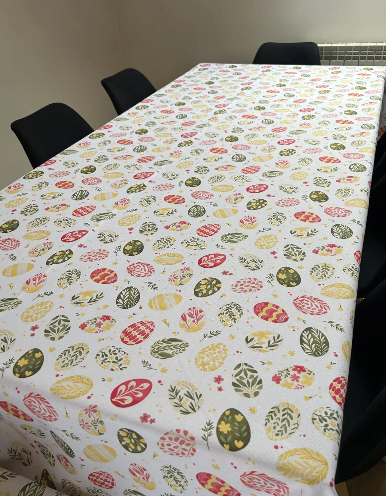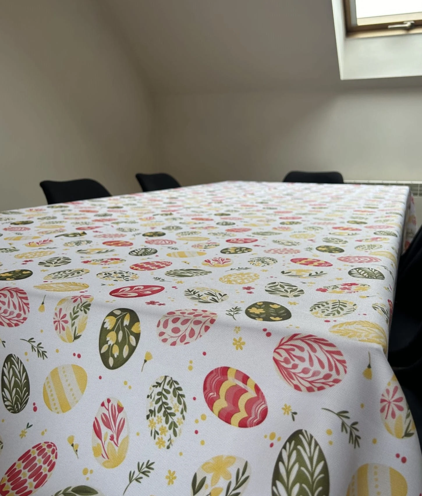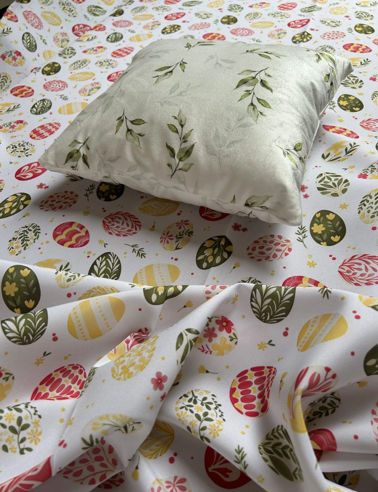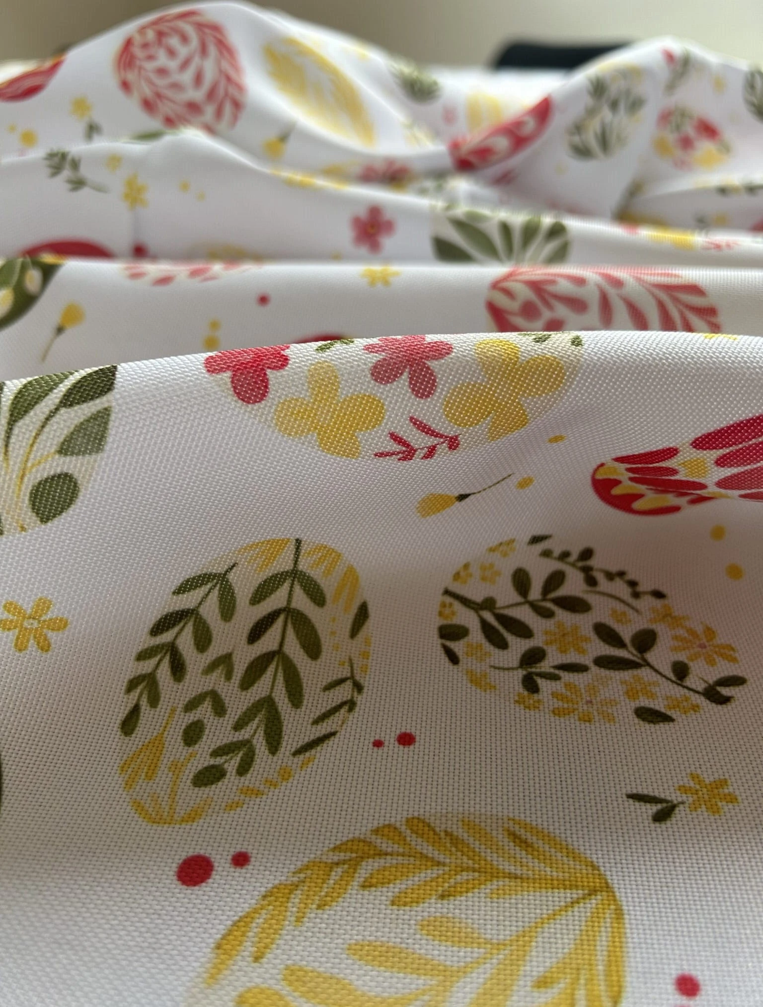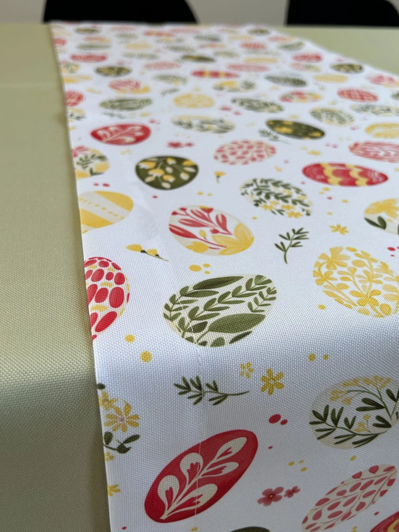 Biały obrus z kolorowym PISANKAMI WIELKANOCNYMI został uszyty z tkaniny wodoodpornej. Ponadto jest on starannie wykończony 4 cm listwą. Występuje w kilku rozmiarach.