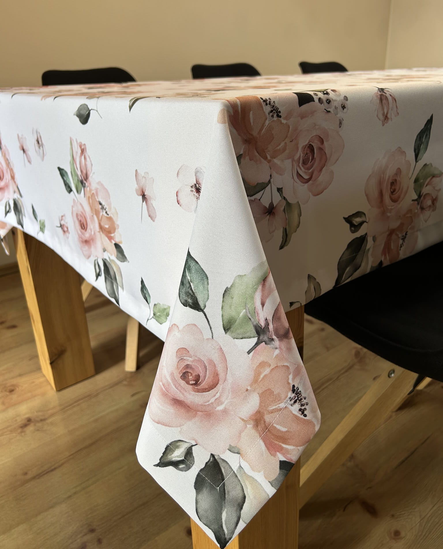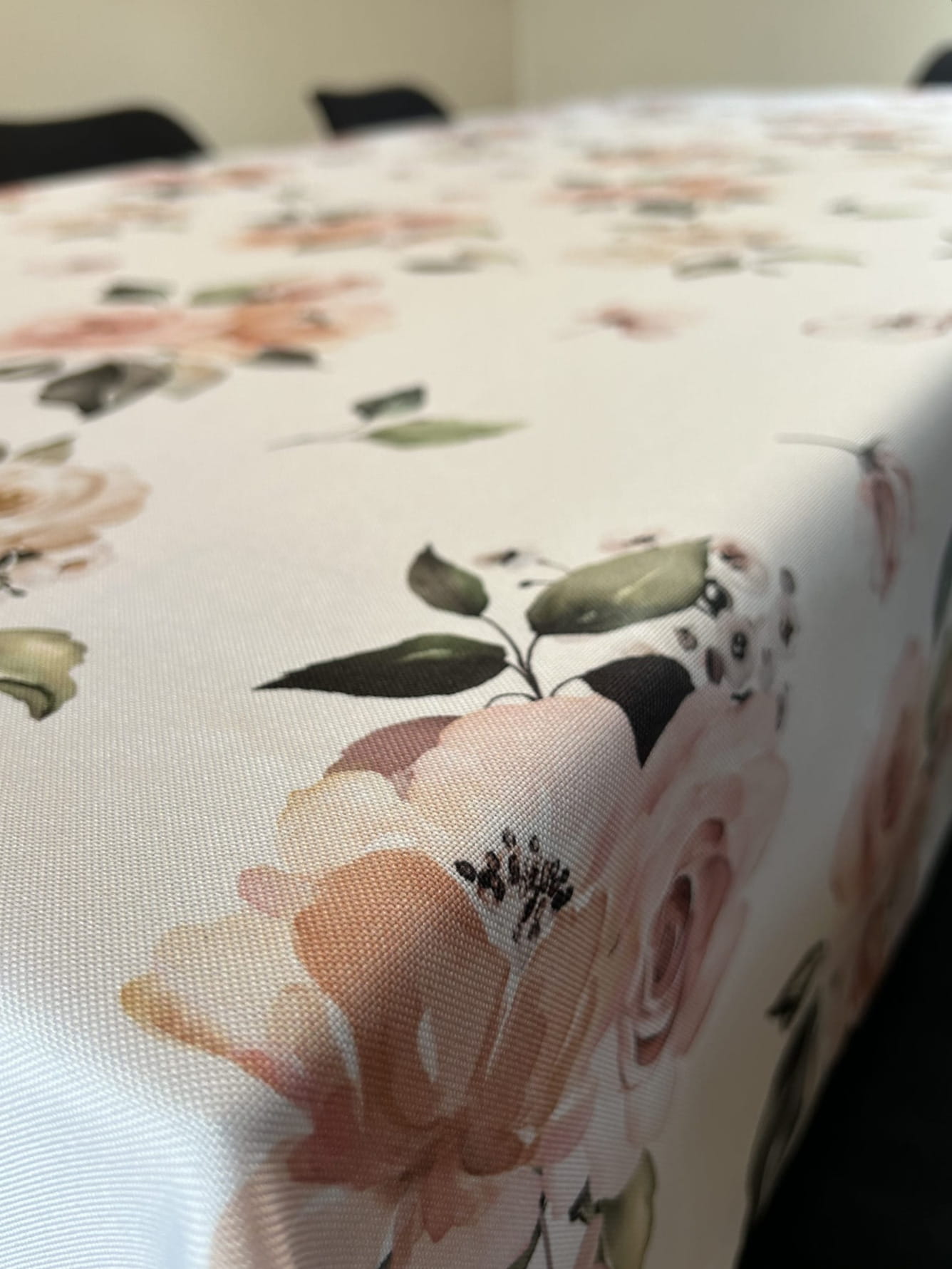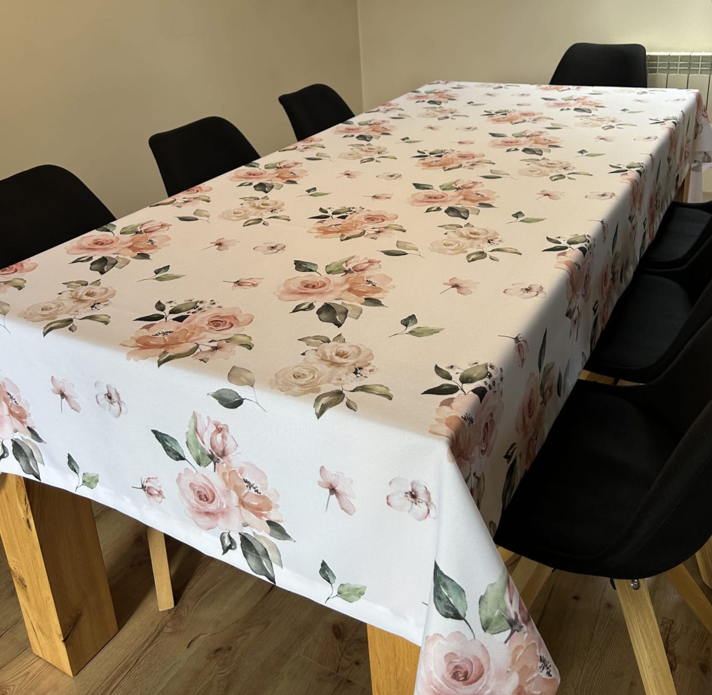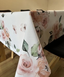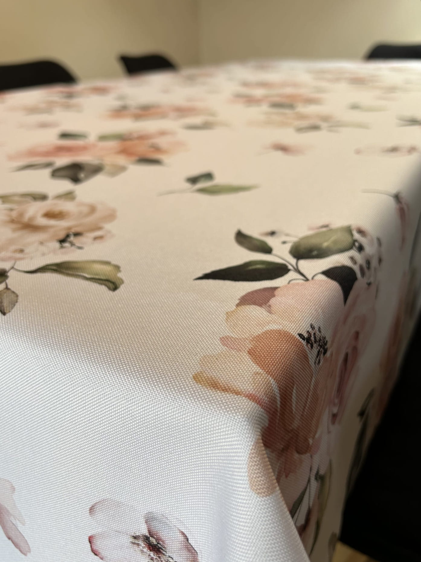 Obrus LANOSA to eleganckie połączenie nadruku kwiatów (w stonowanym kolorze różu, beżu, zieleni) oraz bieli (tkaniny wodoodpornej, z której są produkowane nasze obrusy). Każdy obrus został starannie uszyty w pracowni. Ma doskonale wykonaną 4 cm listwę na brzegach (podszyty ten sam materiał).