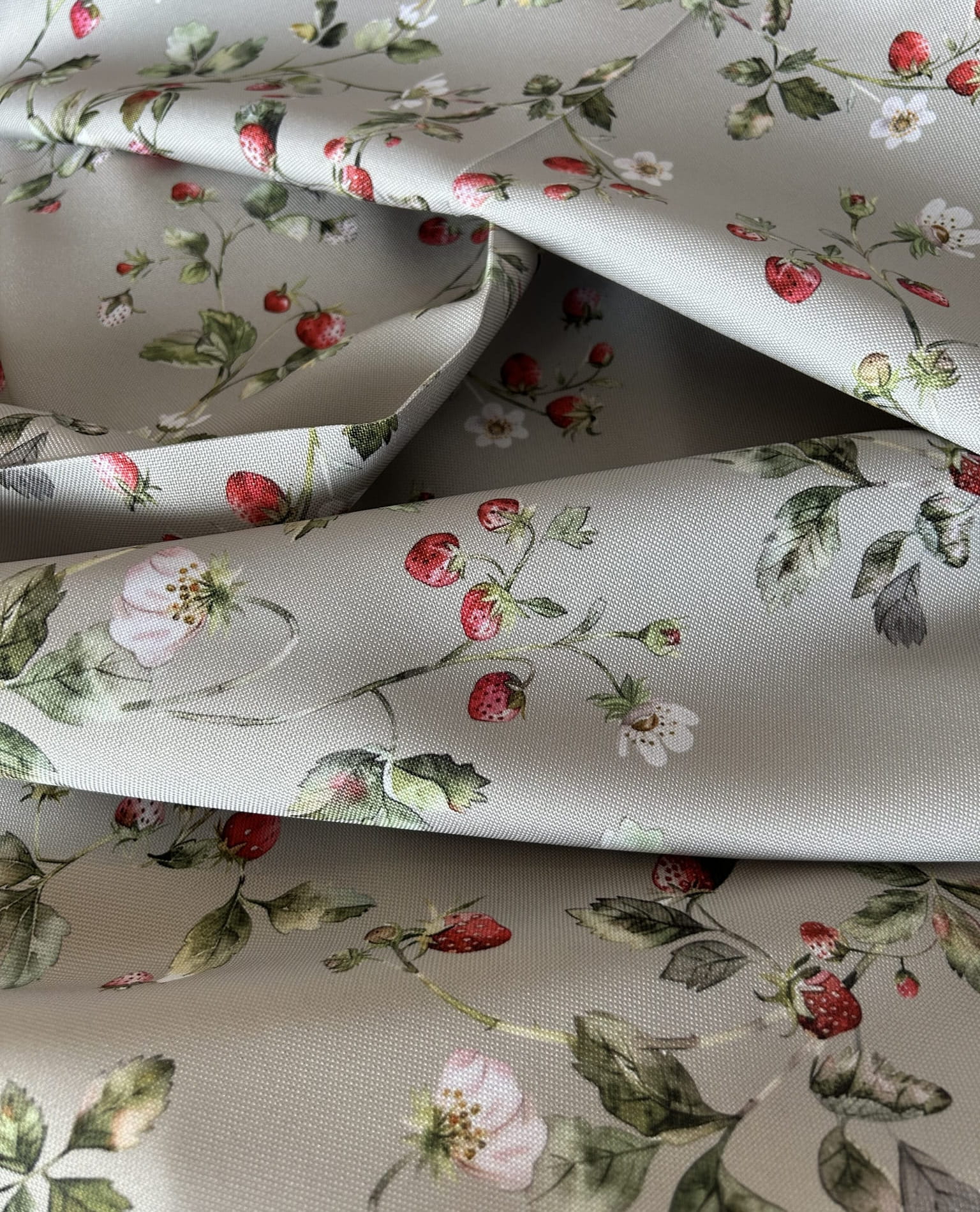 Obrus POZIOMKI to eleganckie połączenie nadruku owoców na wodoodpornej tkaninie, która jest w szałwiowym kolorze. Każdy OBRUS jest starannie szyty w naszej firmie. Ma doskonale wykonaną 4 cm listwę na brzegach (podszyty ten sam materiał). Obrus POZIOMKI dostępny jest w kilku rozmiarach. Ponadto, można kupić do "domowego zestawu" bieżnik i/lub serwetkę ;)