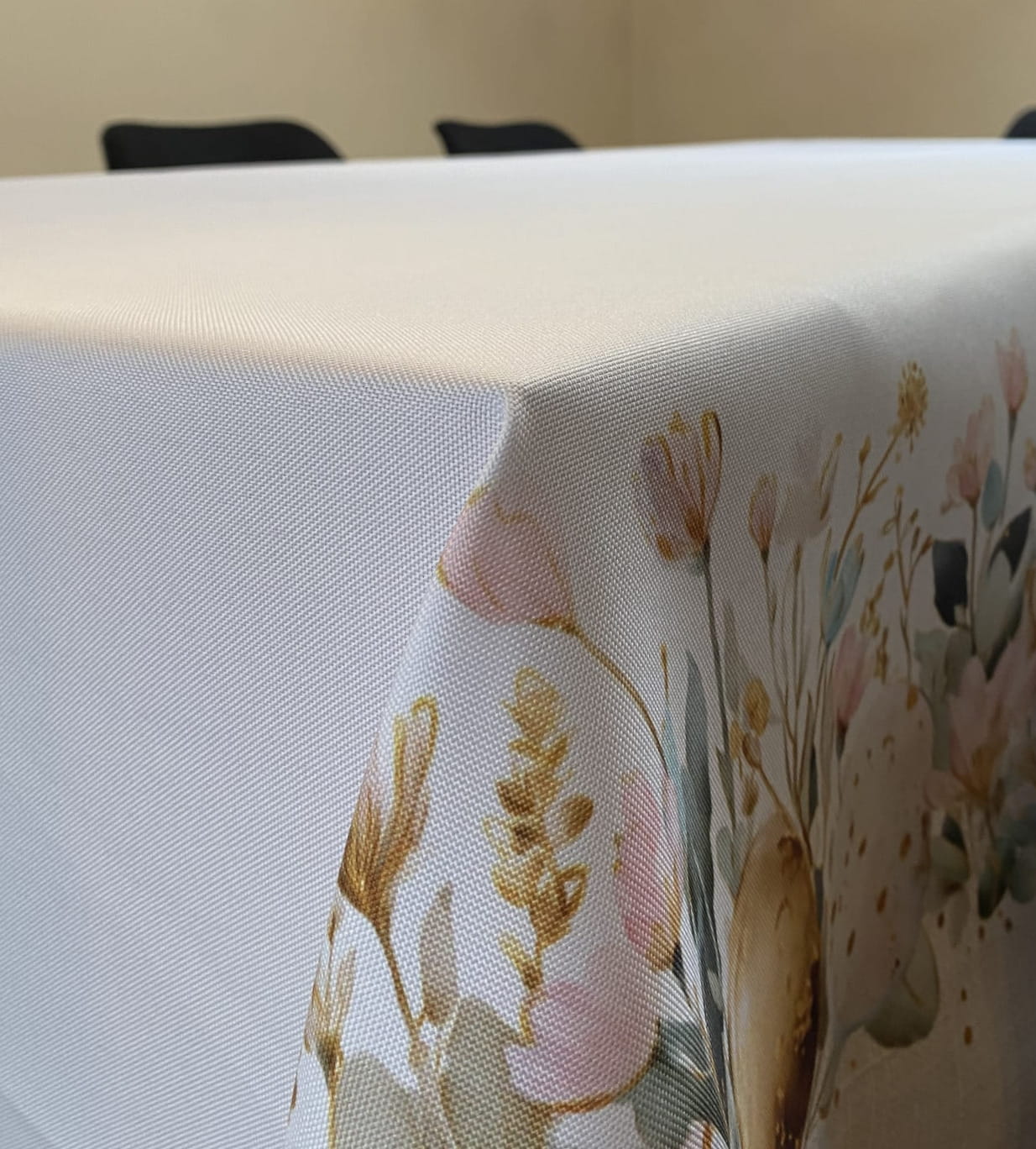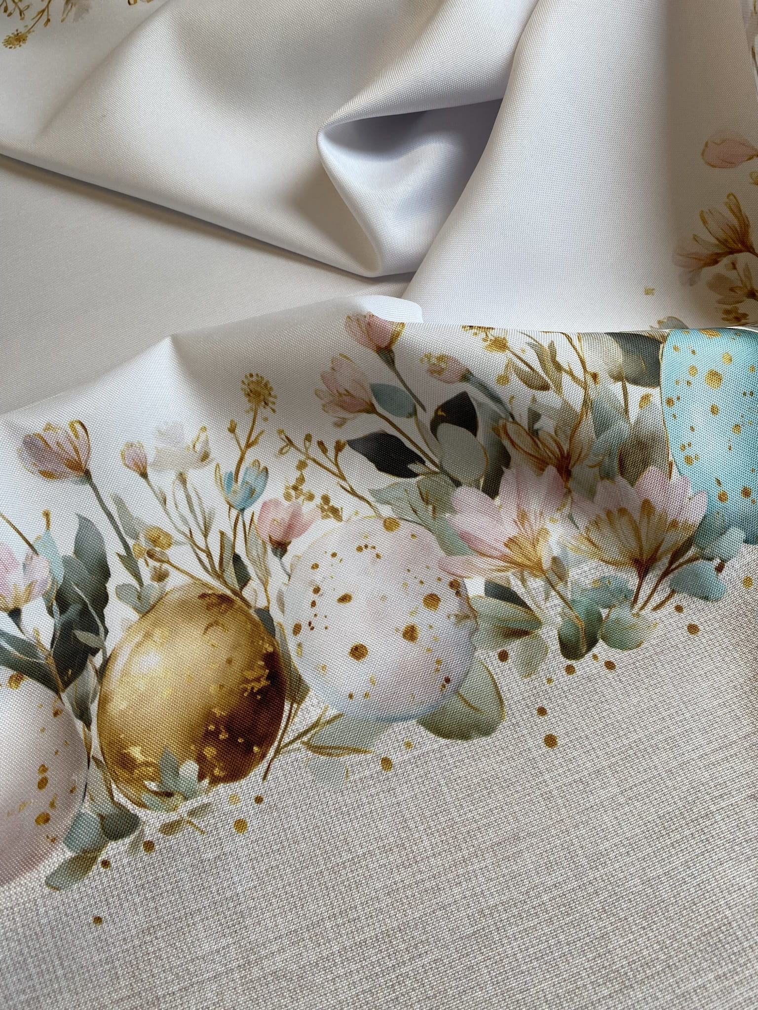Biały obrus WIELKANOCNE PISANKI z kolorowymi szlakami został uszyty z bawełnianej tkaniny wodoodpornej. Pastelowy wzór świątecznych pisanek i kwiatów oraz delikatnych "mazgai" beżowych jest symetrycznie nadrukowany wzdłuż końców dłuższych boków. Każdy ma szerokość +/- 29 cm. Dominują tutaj pastelowe, stonowane kolory: beż, róż, złoto, zieleń, turkus. Natomiast szerokość białej tkaniny, która jest czysta od nadruki i pozostaje środkiem obrusu (od szlaku do szlaku) wynosi +/- 92 cm.