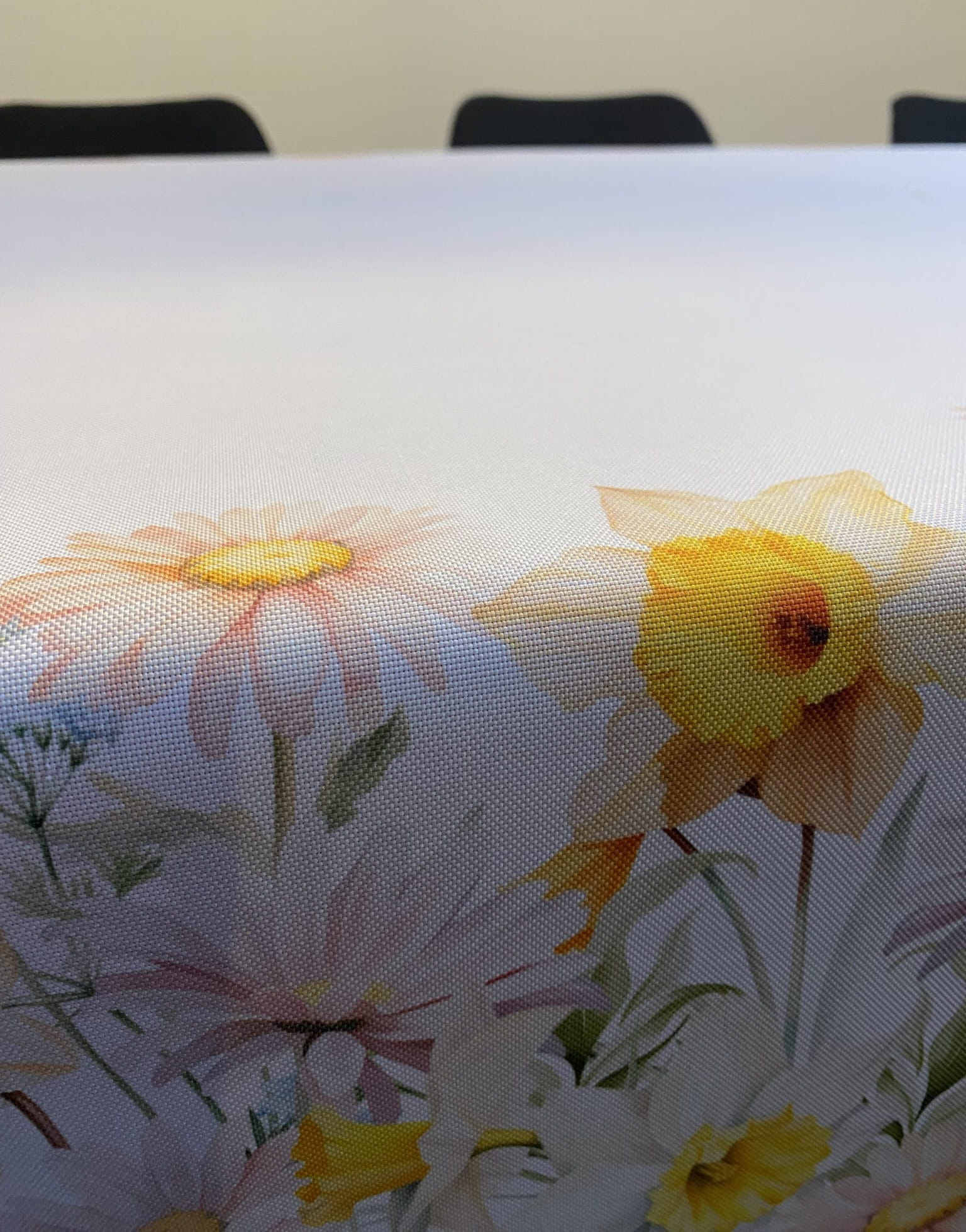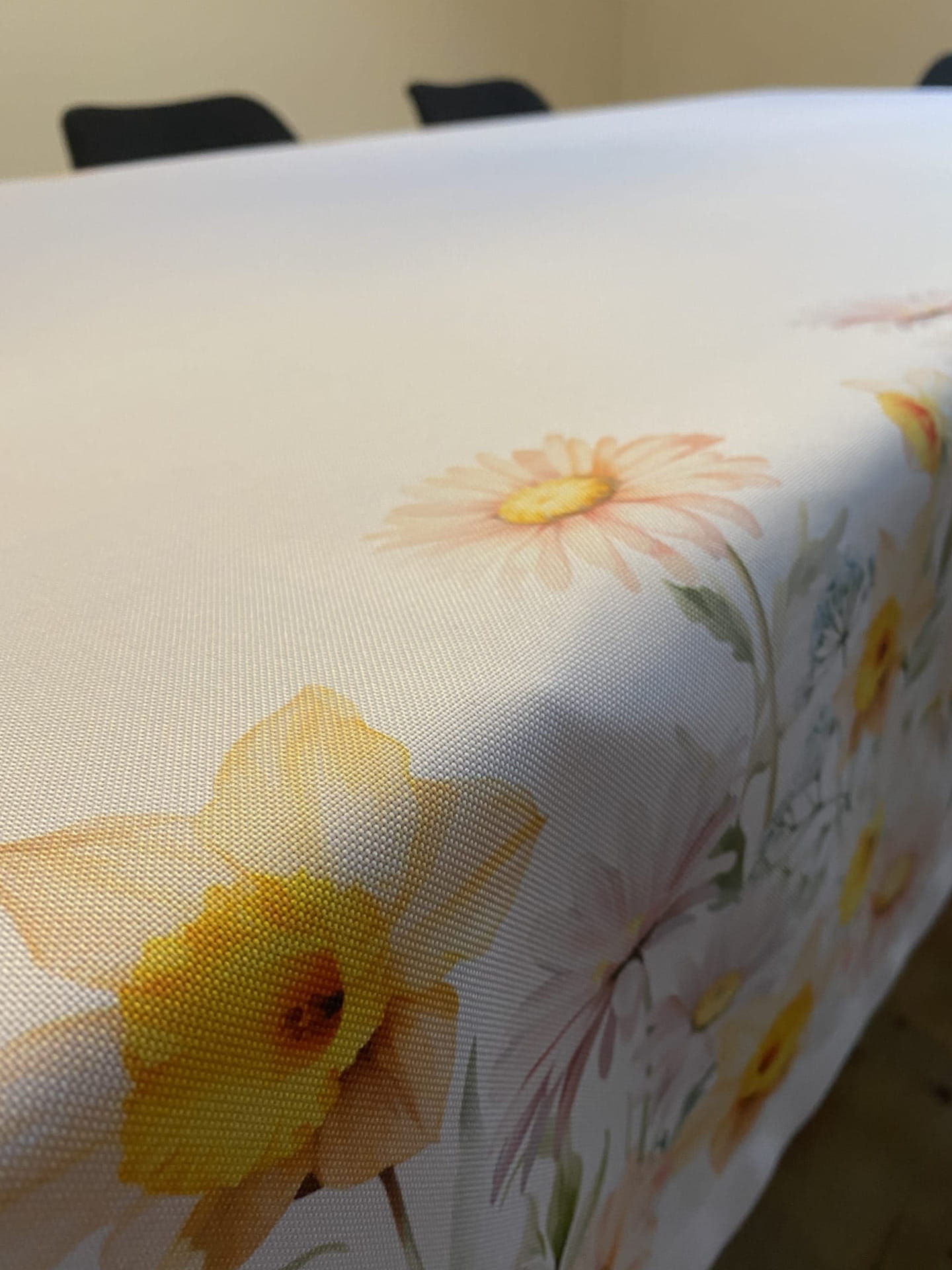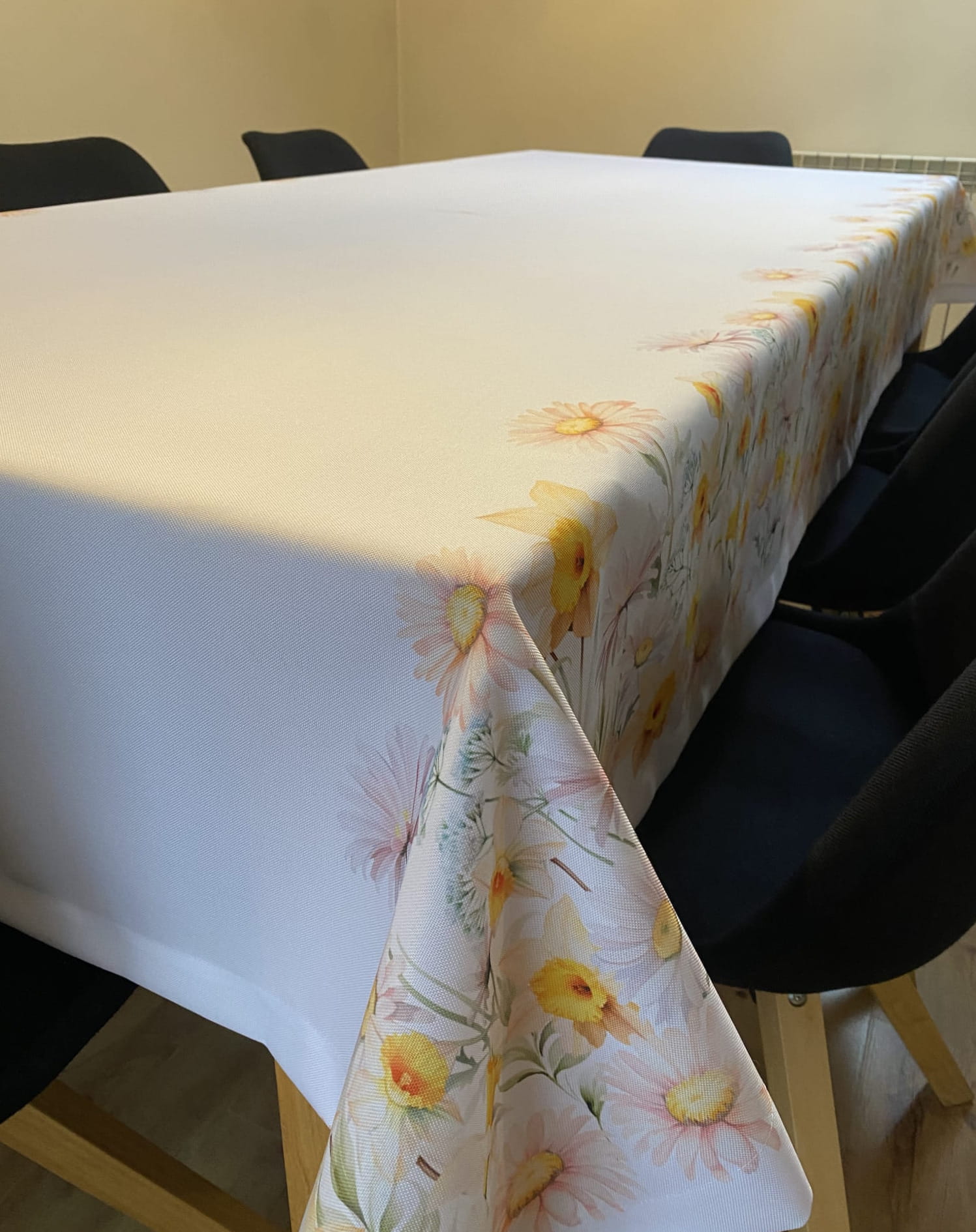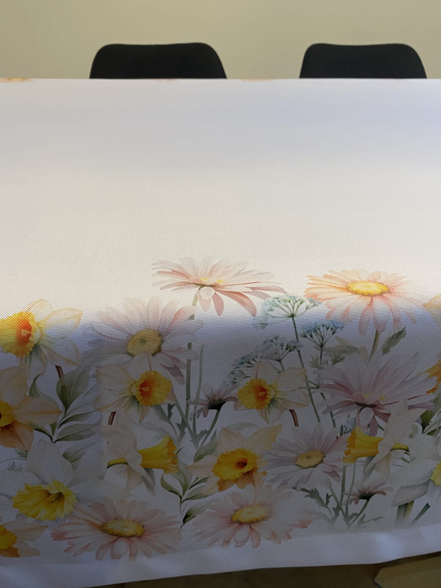 Biały obrus WIOSENNA POLANA z kolorowymi, kwiatowymi szlakami został uszyty z tkaniny wodoodpornej. Nadruk kwiatów o szerokości +/- 30cm jest symetryczny wzdłuż końców dłuższych boków. Delikatne, wiosenne, wielkanocne, stonowane kolory kwiatów w połączeniu z "czystą" bielą daje elegancki efekt naszej konfekcji. Szerokość białej tkaniny, która jest czysta od nadruki i pozostaje środkiem obrusu (od szlaku do szlaku) wynosi +/-85 cm.
