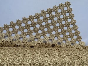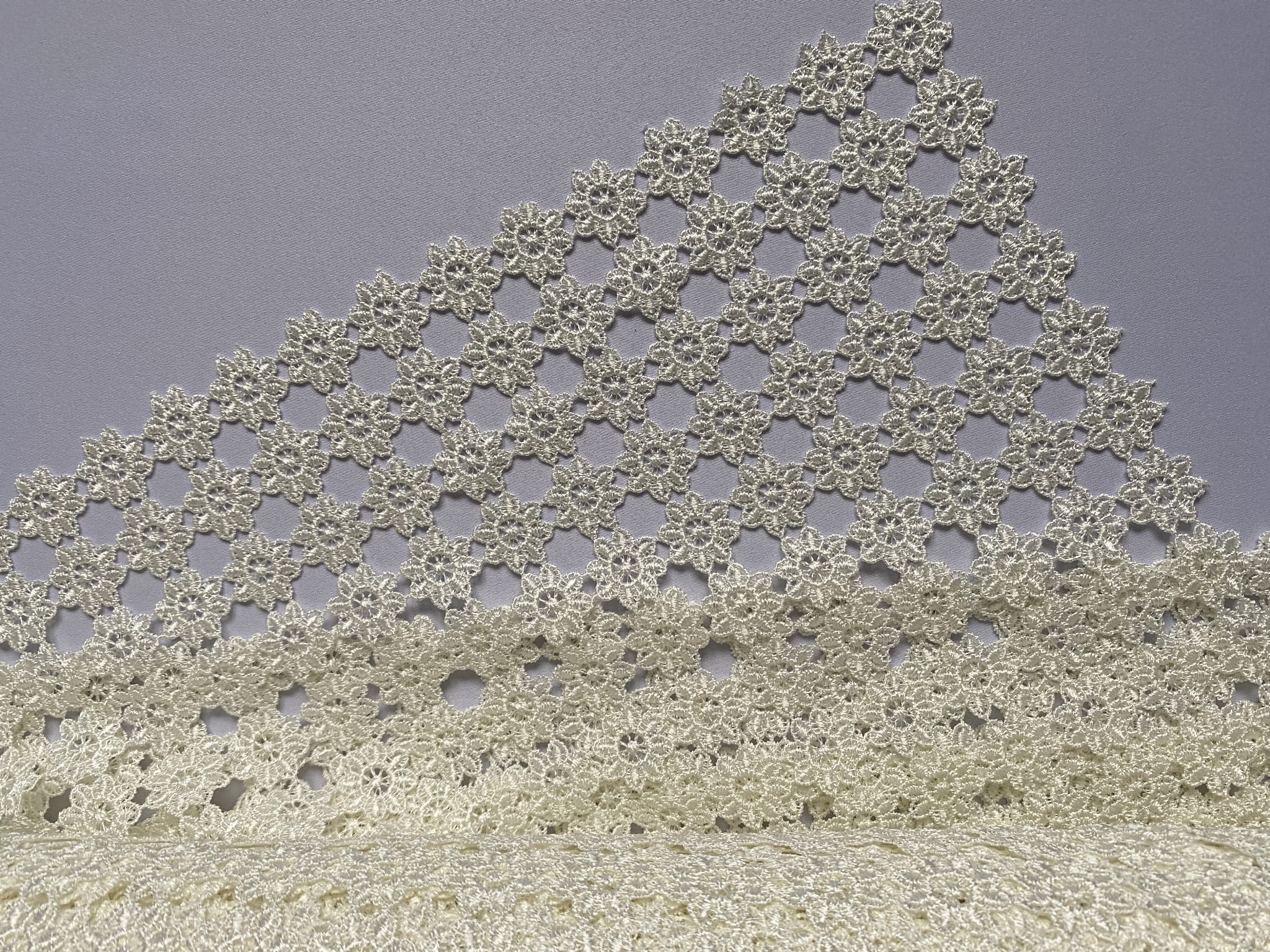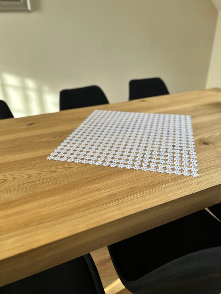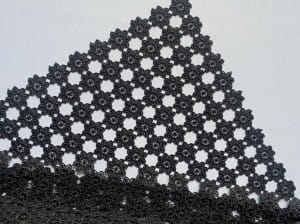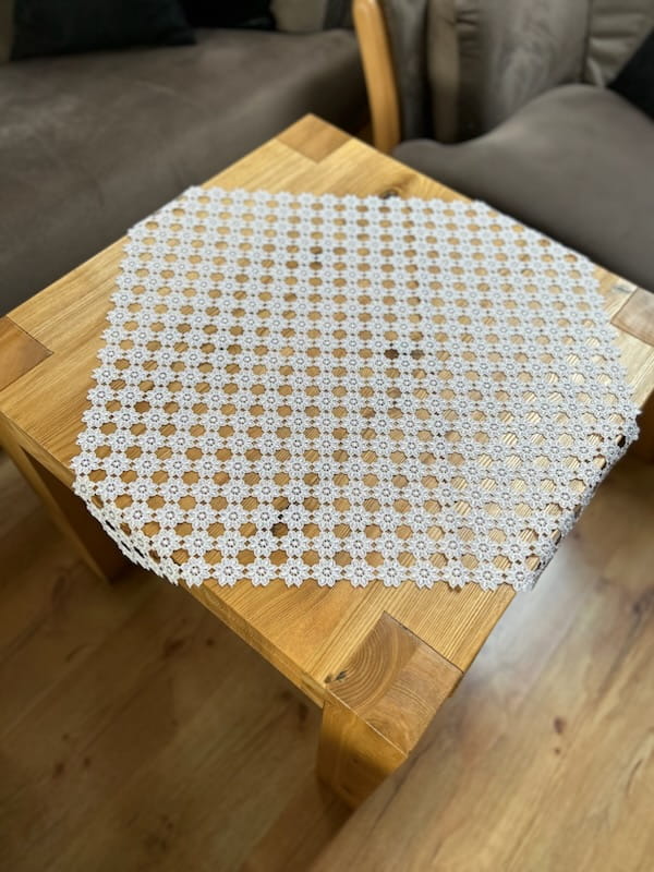 Elegancka serweta rozmiar 70 cm x 70 cm w całości wykonana jest z gipiury, przypominającej koronkę. Tkanina jest utkana z powtarzających się elementów w kształcie kwiatka. Istotną zaletą tej serwety jest materiał, który nie wymaga PRASOWANIA.