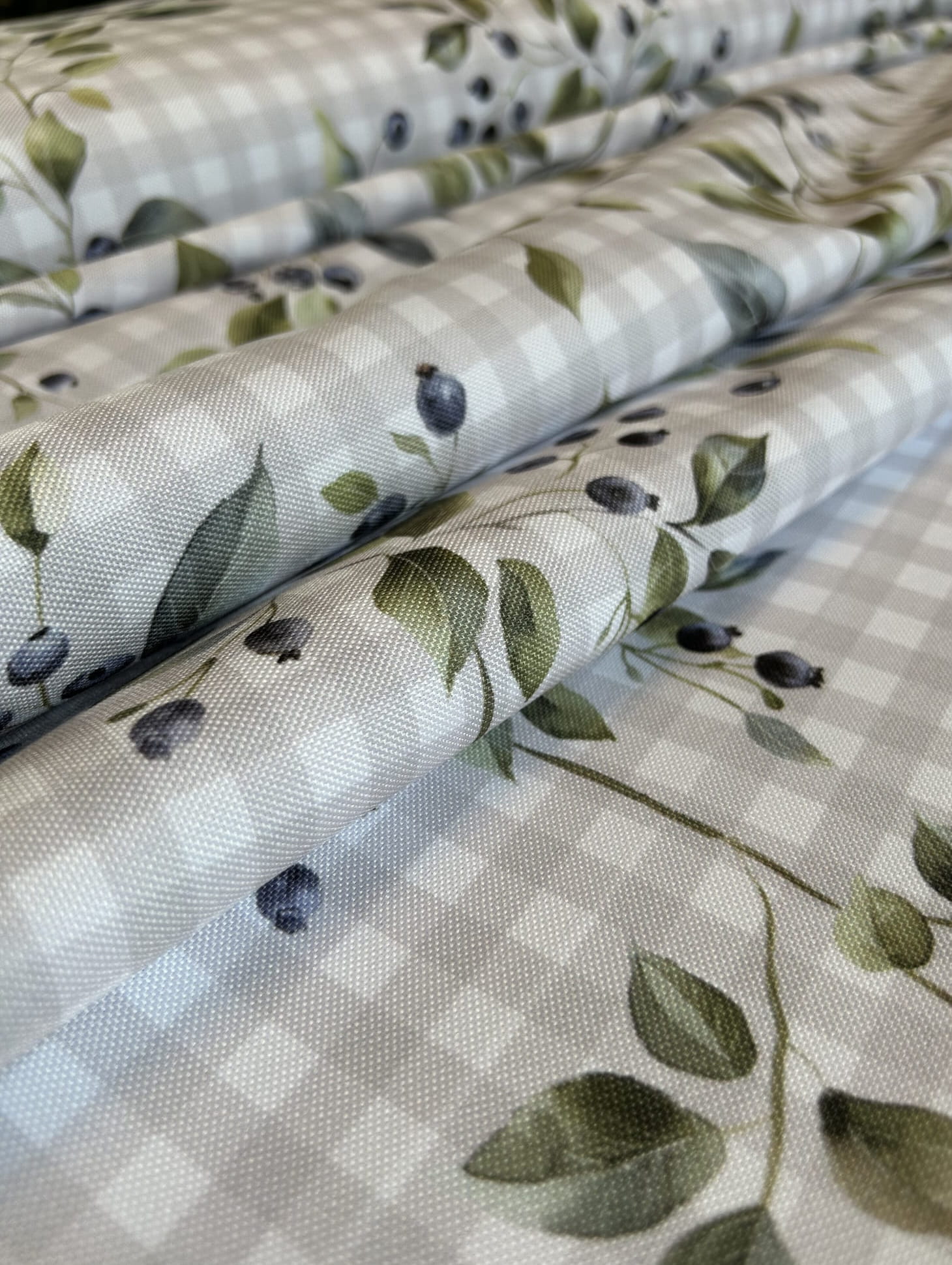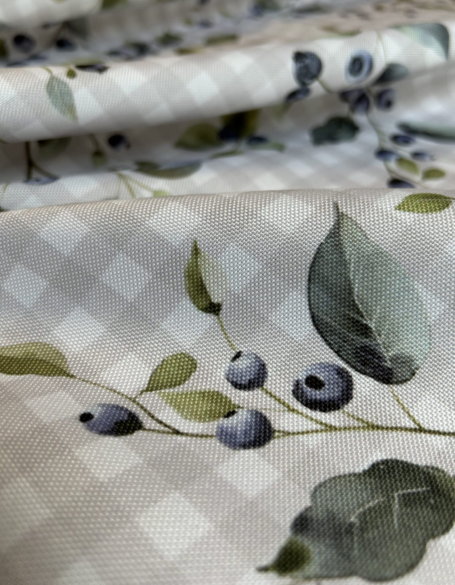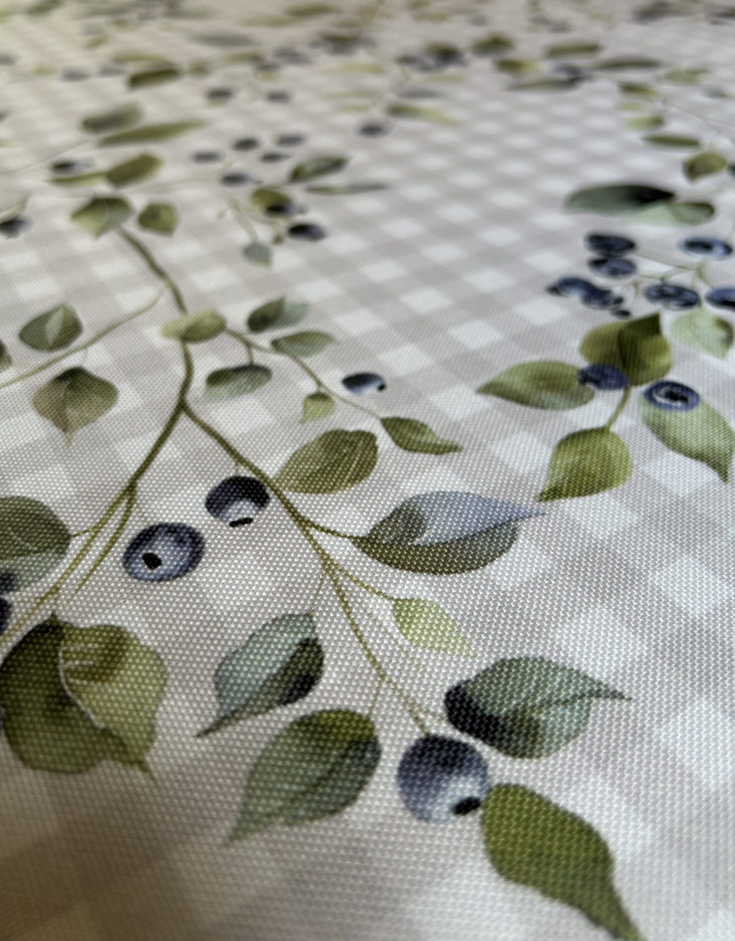 SERWETA JAGODY to eleganckie połączenie nadruku owoców, zielonych gałązek i beżowo-szarej kraty na białej tkaninie wodoodpornej. Każda SERWETA jest ł starannie szyta w naszej firmie. Ma doskonale wykonaną 4 cm listwę na brzegach (podszyty ten sam materiał). SERWETA JAGODY dostępna jest w jednym, kwadratowym rozmiarze 70cm x 70cm. Ponadto, można kupić do "domowego zestawu JAGODY" obrus i/lub bieżnik ;)
